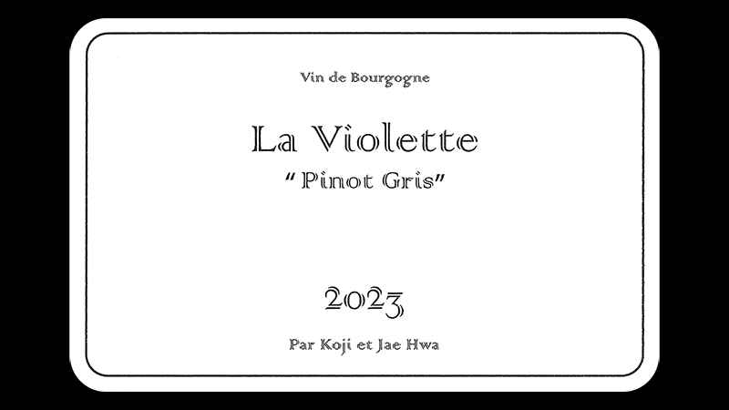 AC Coteaux Bourguignons。2021年に0.2haをフェルマージュ契約したルル・ヴェルジー村の区画「ラ・ヴィオレット」産のピノ・グリ100%。2016年に植樹。即ビオロジック栽培を開始し、2022年に「ビュロー・ヴェリタス」の認証取得。馬で耕作。収量は30hl/ha。除梗率100%。天然酵母のみを使用し、250リットルの砂岩製のアンフォラ3分の1、シャサン社製「グラン・ファン」の新樽3分の1、同1回使用樽3分の1で発酵後、16ヶ月樽熟成。無清澄、ノンフィルターでビン詰め。