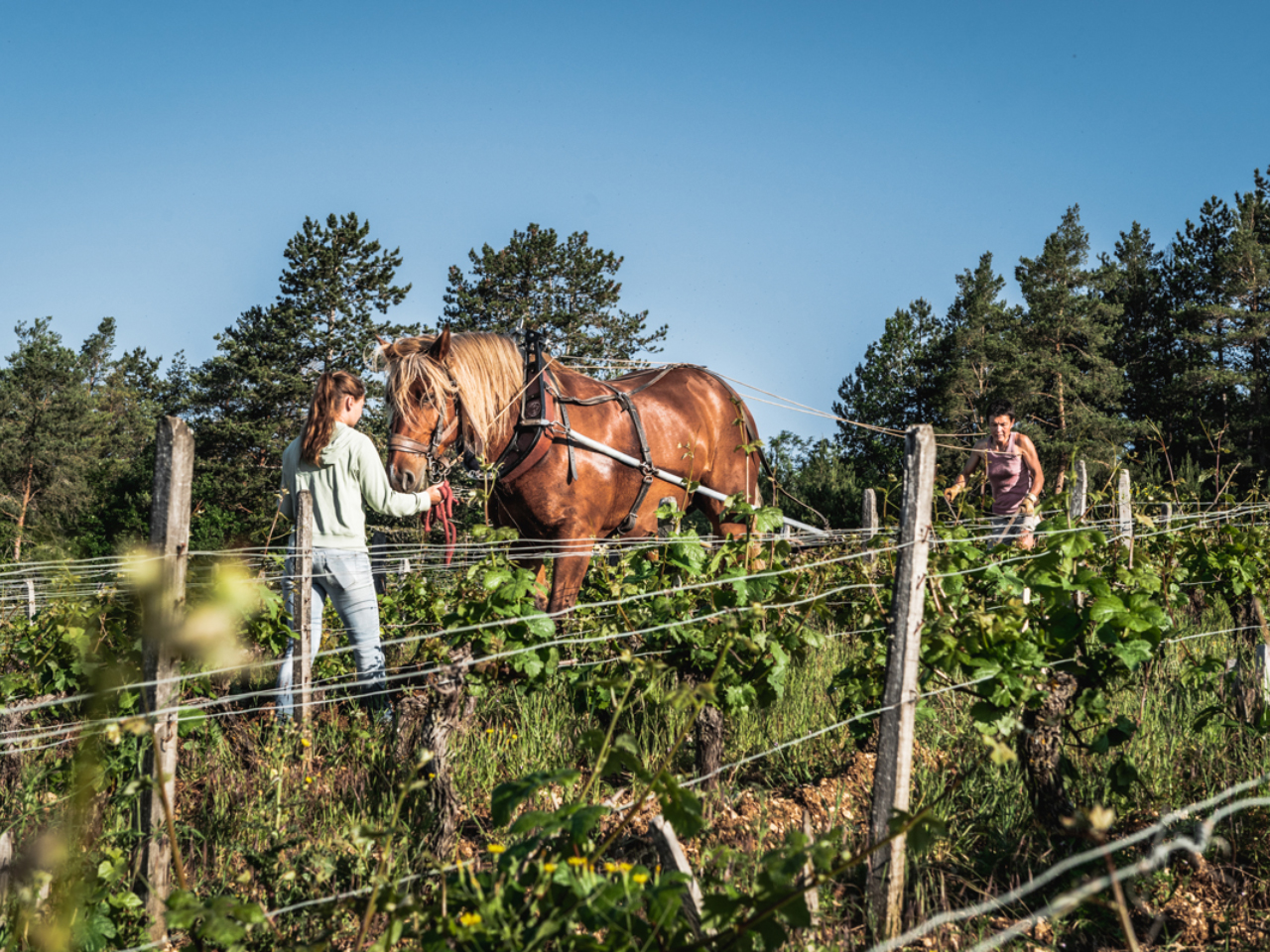 - 2010年よりビオロジック栽培(2013年に「ECOCERT」の認証取得)、2016年にビオディナミに移行(2021年に「demeter」の認証取得)。馬で耕作