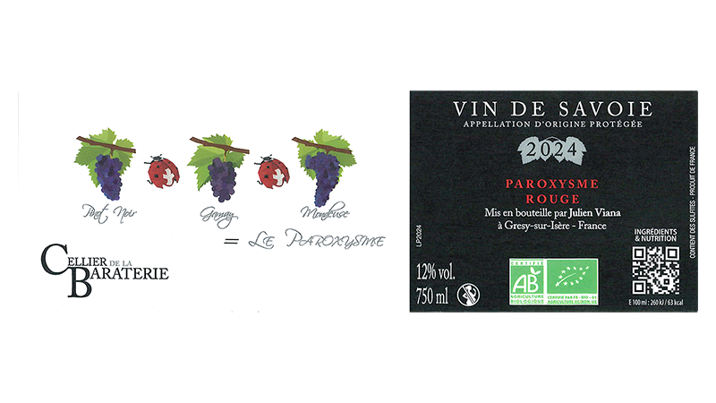 パロキシズムAOC Vin de Savoie。ピノ・ノワール45%、ガメイ45%、モンドゥーズ・ノワール10%のブレンドによる赤ワインです。1.5ha。粘土石灰質土壌。平均樹齢40年のVV。ステンレスタンクで醸造。作品名「パロキシズム」は、「(感覚や感情の)絶頂」という意味です。