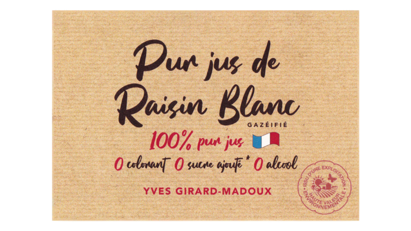 ピュール・ジュ・ド・レザン ブラン ペティヤンジャケール100%の発泡性ぶどうジュースです。「収穫したぶどうをプレスして低温殺菌し、フィルターをかけ、炭酸ガスを注入して出来上がりです!添加物は何も使用していません」(イヴ・ジラール・マドゥー)。