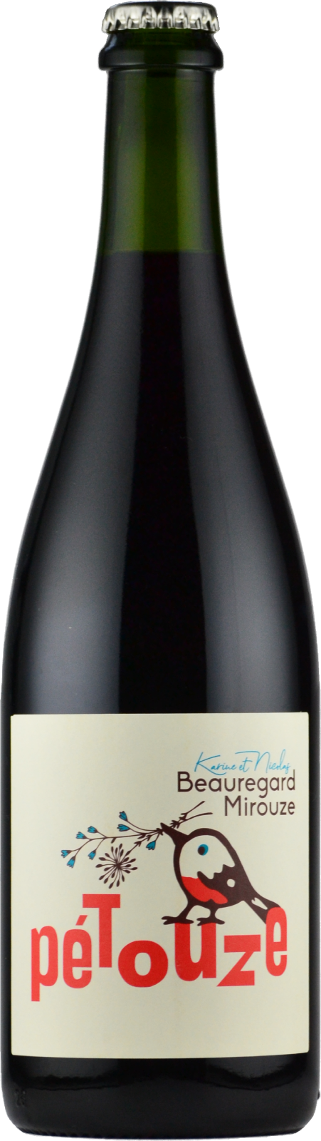 ペトゥーズVin de France。ピレネー山脈麓の標高120メートルの山間畑より。0.15ha。サンソー85%、グルナッシュ15%のブレンド。砂岩質土壌。平均樹齢15年。ステンレスタンクで発酵&1ヶ月間熟成後、同じ畑で採れたぶどうの果汁を加えて8ヶ月間ビン内二次発酵させたペティヤンです。自家製ぶどう果汁由来のドザージュは約20g/l。ビン詰め時にのみ極少量のSO2を使用。作品名の「Pétouze」は「Pétillant」と「Mirouze」を掛け合わせたもので、ラベルはこの地に多く生息する小鳥をモチーフにしたものです。