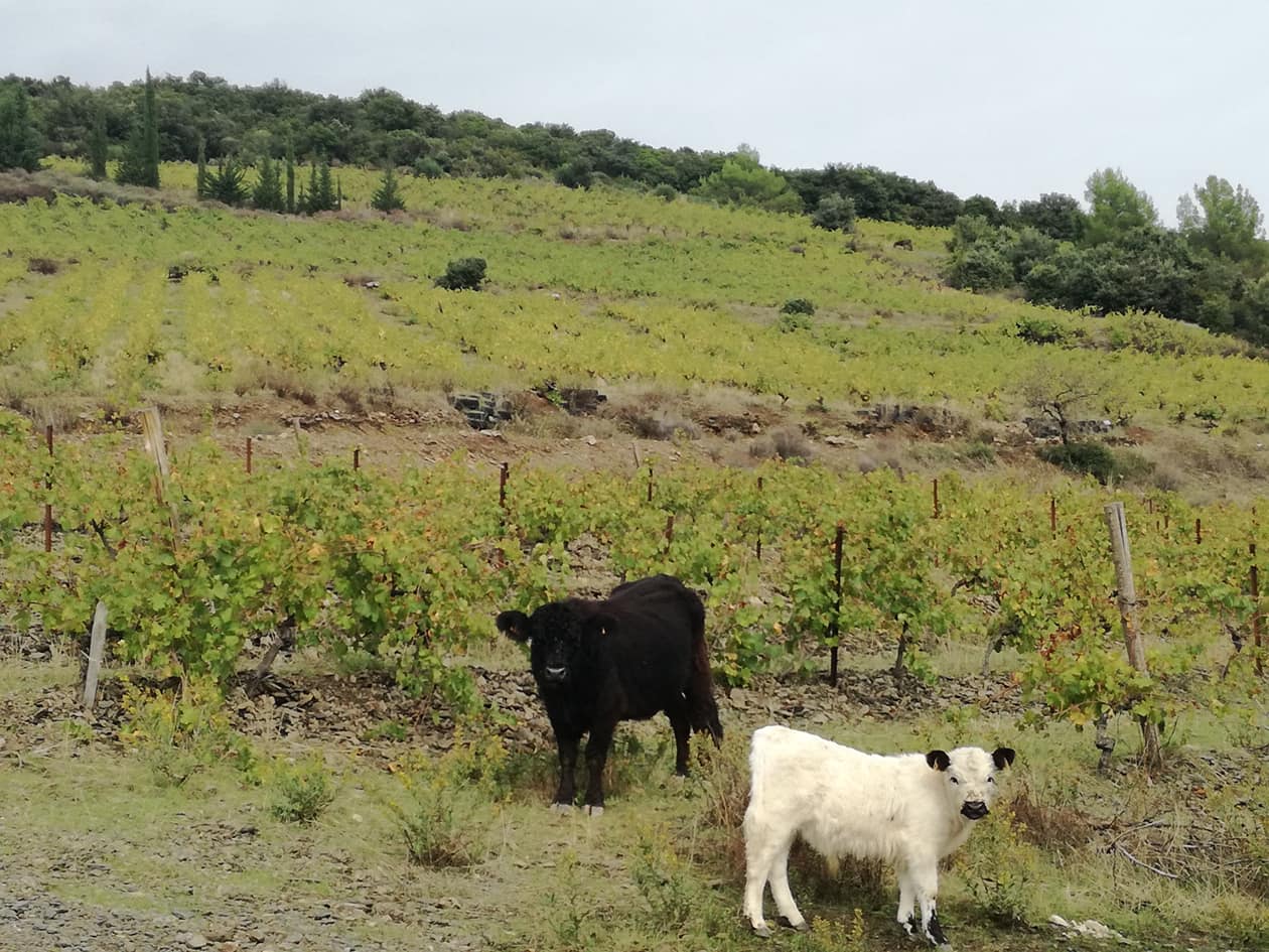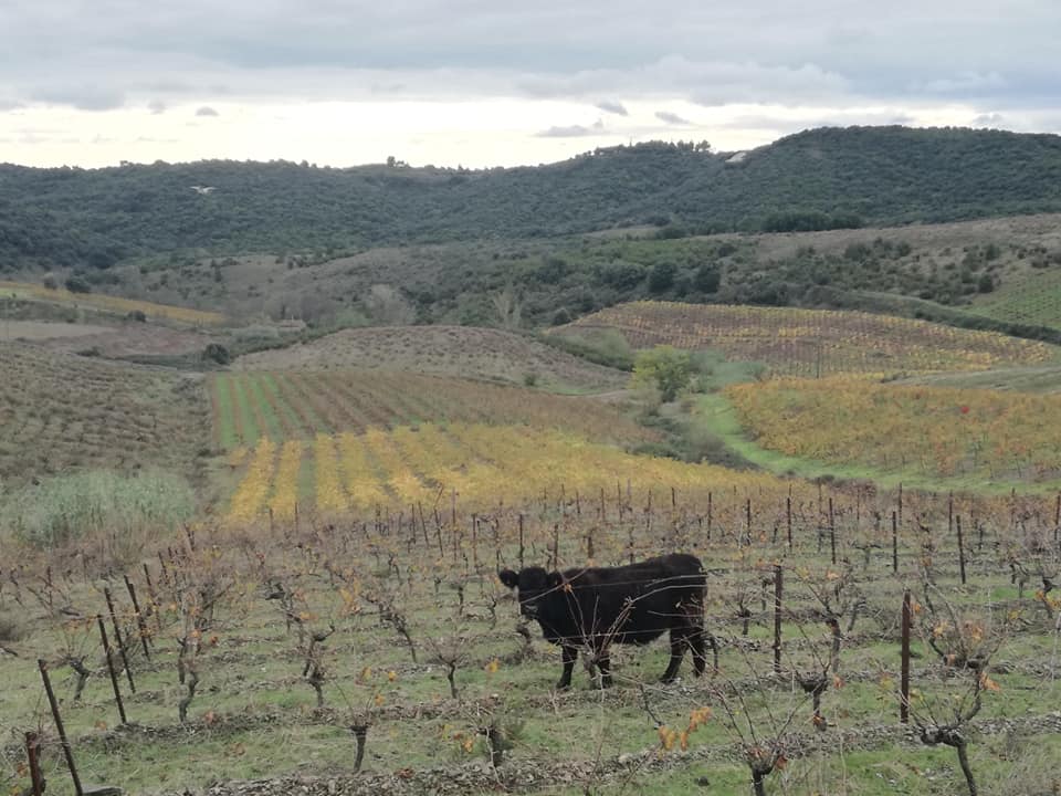 「9月の終わりから4月の初めまで、畑に牛、馬、ロバ、そして羊を放牧しています。それぞれの動物は、それぞれ異なる種類の雑草を食べてくれます。また、彼らが提供してくれる有機肥料も動物ごとに特性が異なり、土中の生態系の活性化に貢献してくれます。畑の畝や周囲には、アーモンドやピスタチオ、オリーブや各種果物の木や、タイム、ローズマリーといったハーブなどを植えています。これらは益虫や小動物の楽園であるばかりでなく、生垣となって害鳥や害虫の侵入を防ぎ、また、ぶどう樹の病気の蔓延や、豪雨による土壌の流出も防いでくれます。動物たちと植物たちは相互に作用しあいながら、ぶどうの生育を助けてくれるのです」。