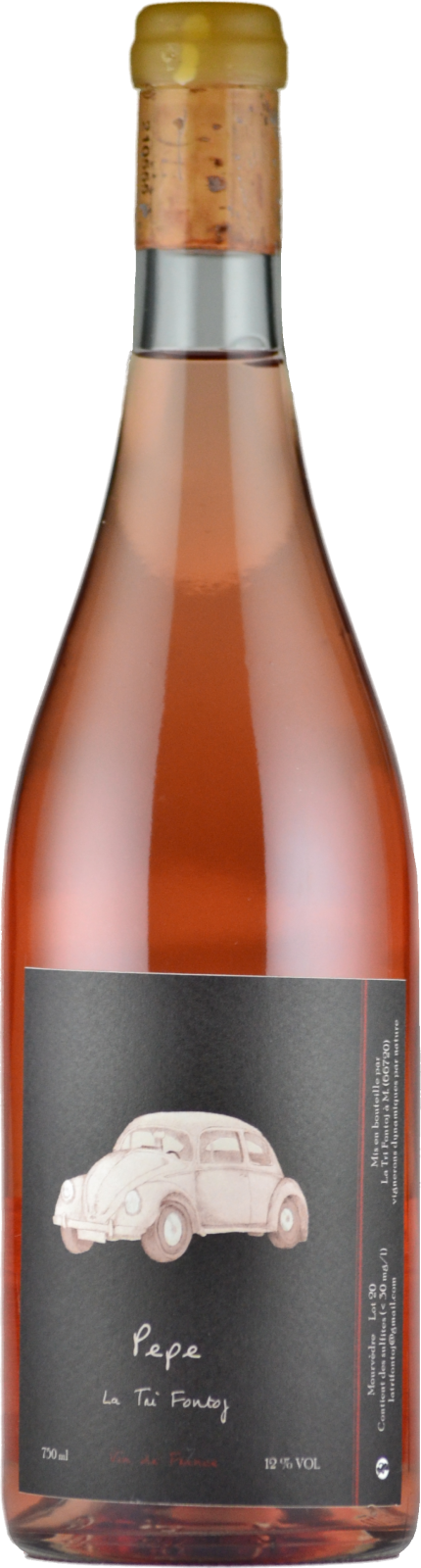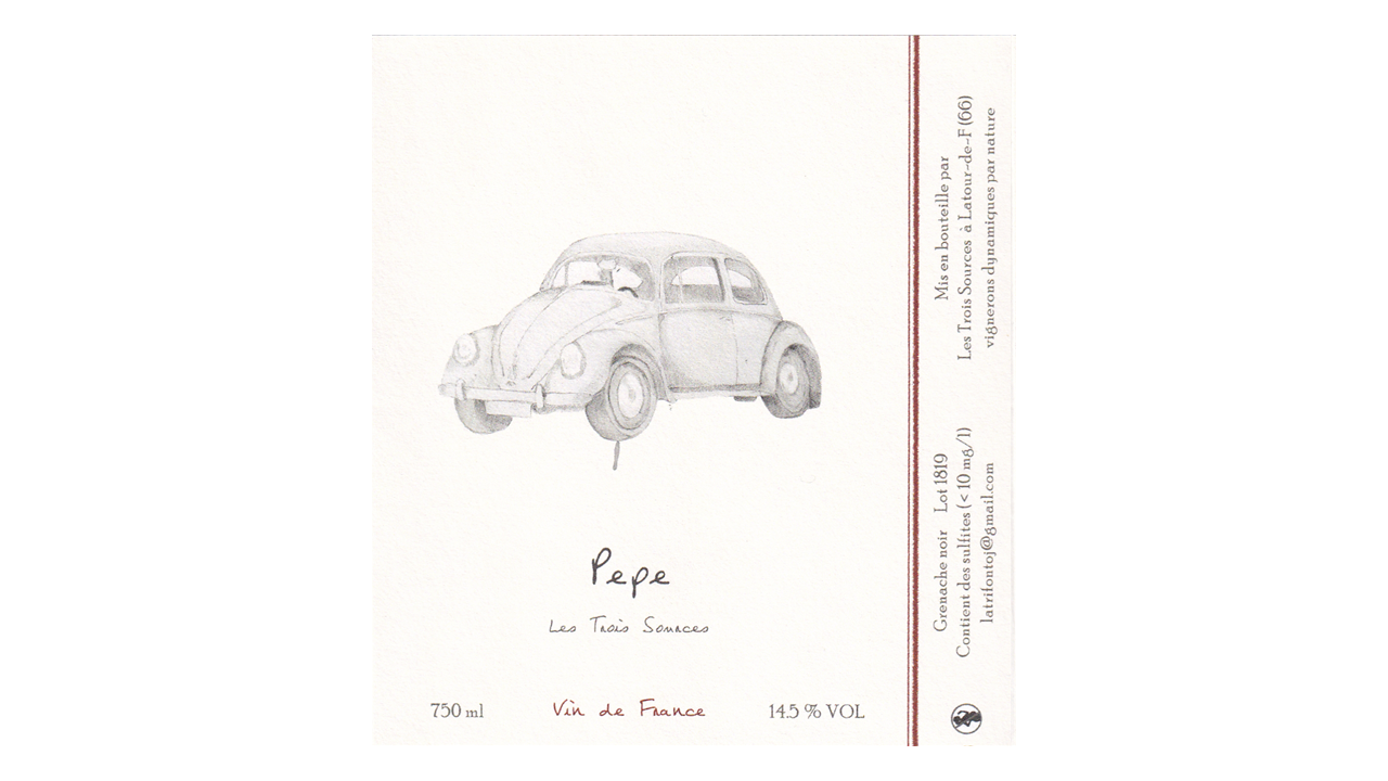 ペペVin de France。ムールヴェードル100%。直接圧搾法によるロゼワインです。ラジゲール村の0.75haの区画より。粘土石灰質土壌。樹齢約15年。収量は20hl/ha。除梗しない。ステンレスタンクでのアルコール発酵が80%進行した段階で、25%を225リットルの樽へ移し、それぞれマロラクティック発酵&6ヶ月間熟成させた後にブレンド。SO2は不使用。作品名の「ペペ」は、シュタインが心から尊敬する元ウルグアイ大統領ホセ・ムヒカの愛称です。ラベルに描かれた車は、ホセ・ムヒカの愛車である「1987年製フォルクスワーゲン・タイプ1」です。