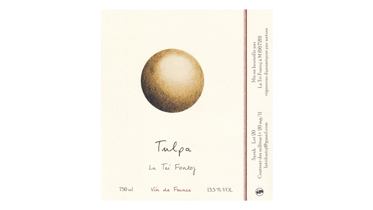 テュルパVin de France。シラー100%。モントネ村の0.45haの区画より。シスト土壌。樹齢約35年のVV。収量は16hl/ha。除梗50%。グラスファイバー製タンクでアルコール発酵後、225リットルの樽でマロラクティック発酵&12ヶ月間熟成。ビン詰め時にのみ極少量のSO2を使用。作品名の「テュルパ」は神秘主義における概念「タルパ」(精神的な力によって作成された存在や物体)のことで、この作品が、シュタインが魂を捧げた渾身作であることを表現したものです。ラベルに描かれた球体はアメリカのドラマ「ツインピークス」に出てくるもので、ドラマ中で球体の形が変わるシーンを、シュタインの魂がワインに変わることになぞらえたものです。