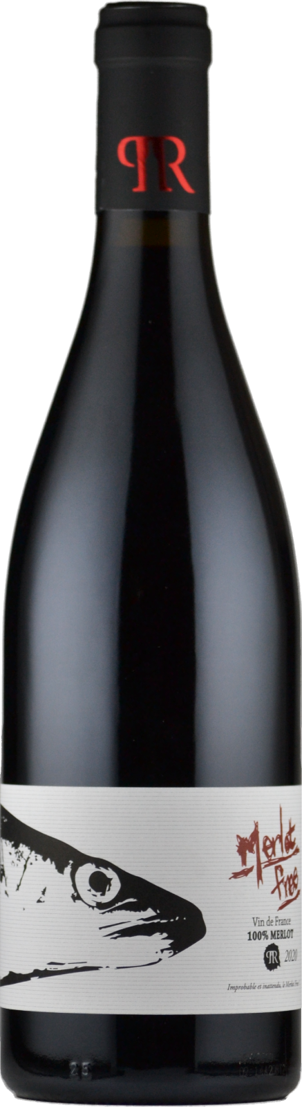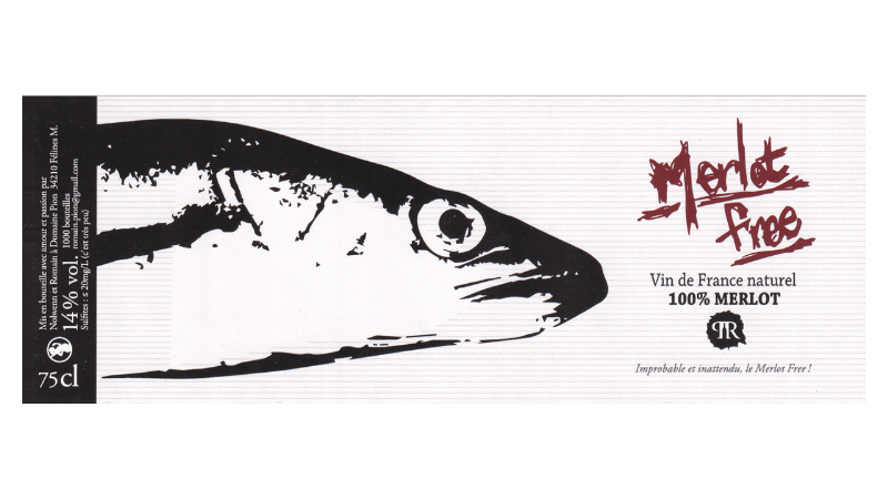 Vin de France。メルロ100%。ミネルヴォワ北方、カッサニョル村の標高400mの区画より。1ha。シスト(スレート片岩)土壌。平均樹齢20年。収量25hl/ha。除梗50%。ステンレスタンクで発酵後、10ヶ月間シュール・リー熟成。清澄は行わず、軽くフィルターをかけてビン詰め。年によってビン詰め時にのみ極少量のSO2を使用。ラベルの魚は、「Merlot free」の発音が「merlan frit」(メルラン(タラ科の魚)のフライ)に似ていることと、柔らかな味わいのこのメルロが一定のお魚料理にもよく合うことを表現したものです。