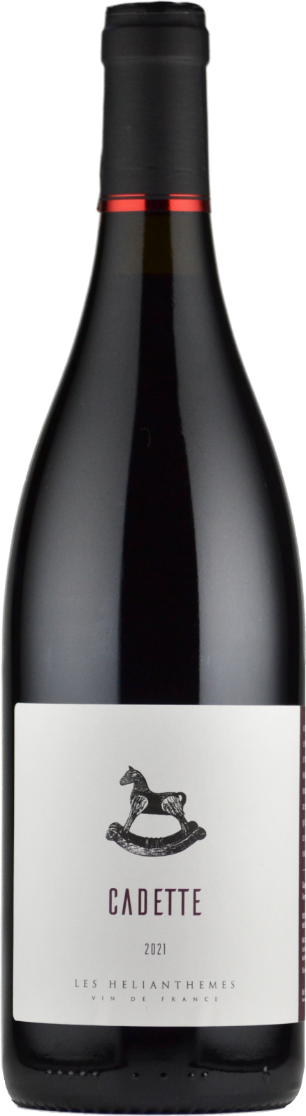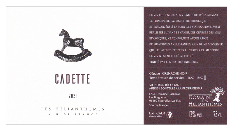 Vin de France。グルナッシュ・ノワール100%。パサ村の0.4haの区画より。花崗岩質・砂質土壌。樹齢約40年のVV。収量は20hl/ha。ステンレスタンクで発酵後、6ヶ月間熟成。作品名の「カデット」は「末っ子」の意味で、このキュヴェをはじめて造った際、たまたま香りをかいだ末娘のマリーちゃんが「フランボワーズとオレンジのすごい香り!」と言ってくれたことに由来します。木馬については、エノログがこのキュヴェの試飲に訪れた際、どのタンクのワインがサラブレッドでどのタンクのワインがポニーだと思うか聞いたところ、どれも素晴らしくサラブレッドやポニーに例えて優劣はつけがたいと言ったため、じゃあ全部木馬ということにしよう、という楽しい会話があったことに由来します。