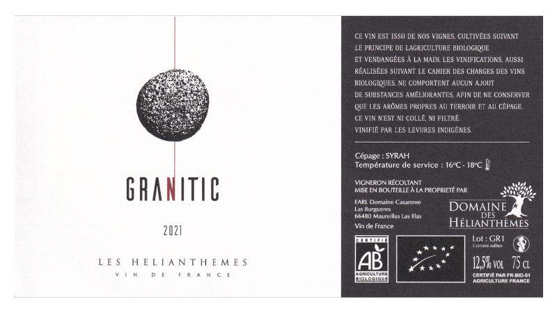 Vin de France。シラー100%。パサ村の0.7haの区画より。花崗岩質・砂質土壌。樹齢約25年。収量は25hl/ha。ステンレスタンクで発酵後、6ヶ月間熟成。作品名の「グラニティック」は「花崗岩の(土壌)」という意味で、貴品種シラーと花崗岩土壌の圧倒的な好相性を讃えるものです。