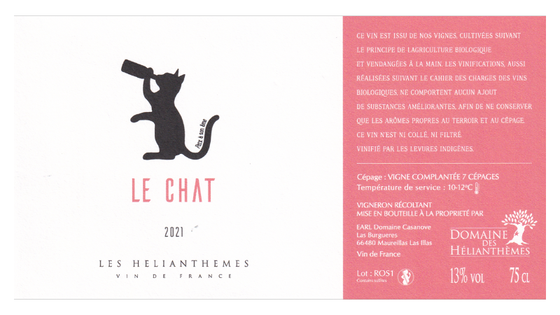 Vin de France。グルナッシュ・ノワール、グルナッシュ・グリ、グルナッシュ・ブラン、カリニャン・ノワール、カリニャン・グリ、カリニャン・ブラン、マカベオの混植・混醸(全品種およそ同一比率)。直接圧搾法によるロゼワインです。モレイヤ・ラ・イラ村の0.45haの区画より。花崗岩質・砂質土壌。樹齢約50年のVV。収量は15hl/ha。ステンレスタンクで発酵後、6ヶ月間熟成。作品名の「ル・シャ」は「猫」の意味です。「私は2016年にロゼワインを造りました。しかし発酵の終わり頃に、私の愛するニャンコがこっそり地下のカーヴに入り、ロゼワインのタンクで溺れてしまいました。私はニャンコとロゼワインを同時に失ってしまい、もう二度とロゼワインは造らないと心に決めました。しかし、2019年に取得した素晴らしい混植畑がロゼワインにぴったりだったため、ロゼワイン造りを再開し、ニャンコを永遠にラベルに残すことにしました」。