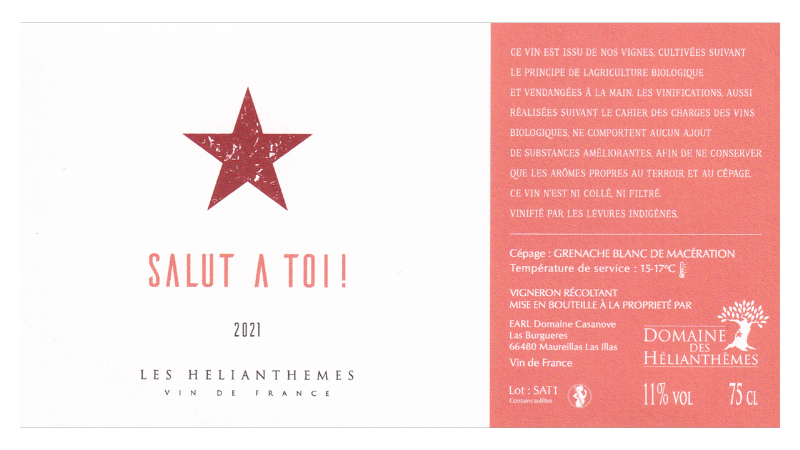 Vin de France。グルナッシュ・ブラン100%。モレイヤ・ラ・イラ村の0.5haの区画より。石英質・砂岩質土壌。樹齢約60年のVV。収量は20hl/ha。ステンレスタンクで果皮とともに30日間マセラシオン発酵させた後、6ヶ月間熟成させたオレンジワインです。作品名の「サリュ・ア・トワ!(やあ、君!)」は1980年代に活躍したパンク・バンド「ベリュリエ・ノワール」の代表曲のタイトルで、東西冷戦時代に世界友好を呼びかけたこの歌と、オレンジワインの製法が発祥地の東ヨーロッパから伝えられてきたことをかけたものです。