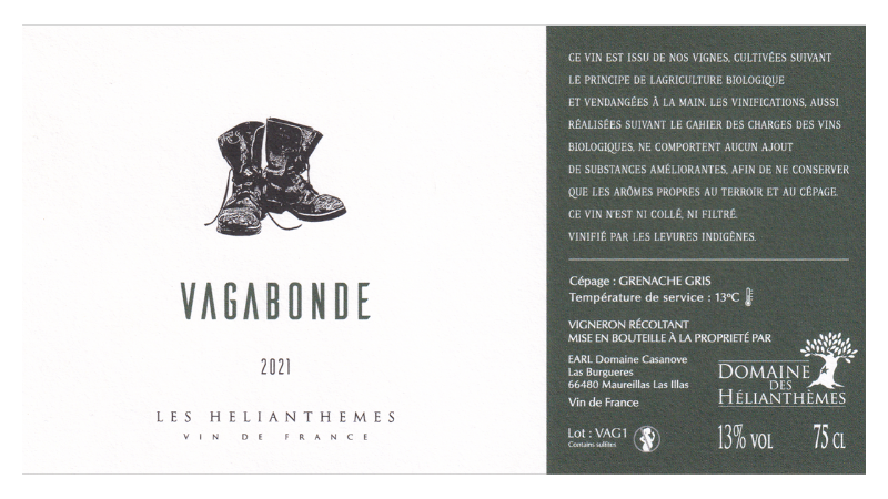 Vin de France。グルナッシュ・グリ100%。モレイヤ・ラ・イラ村の0.6haの区画より。石英質・砂岩質土壌。樹齢約50年のVV。収量は30hl/ha。ステンレスタンクで発酵後、6ヶ月間熟成。作品名の「ヴァガボンド」は「放浪者」の意味で、グルナッシュ・ノワール、グルナッシュ・グリ、グルナッシュ・ブラン、カリニャンが混植された畑から、グルナッシュ・グリのぶどうのみを(樹から樹へと放浪しながら)選別して収穫したことに由来します。