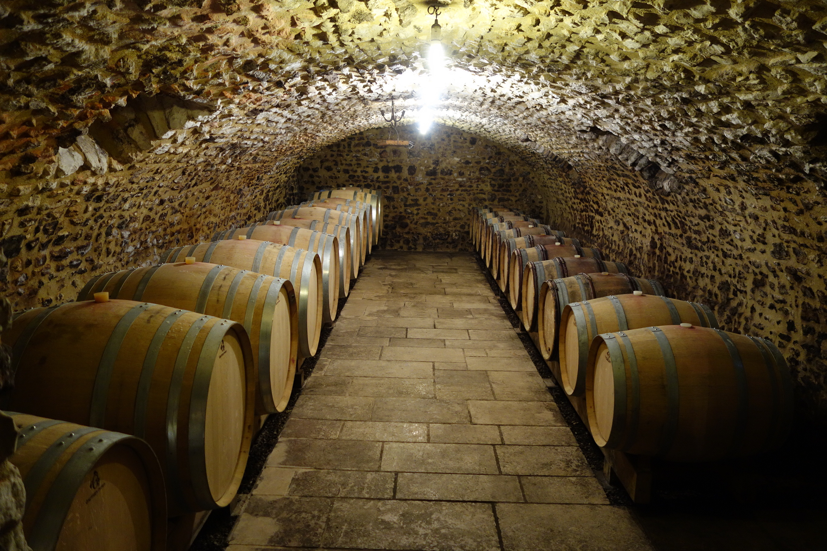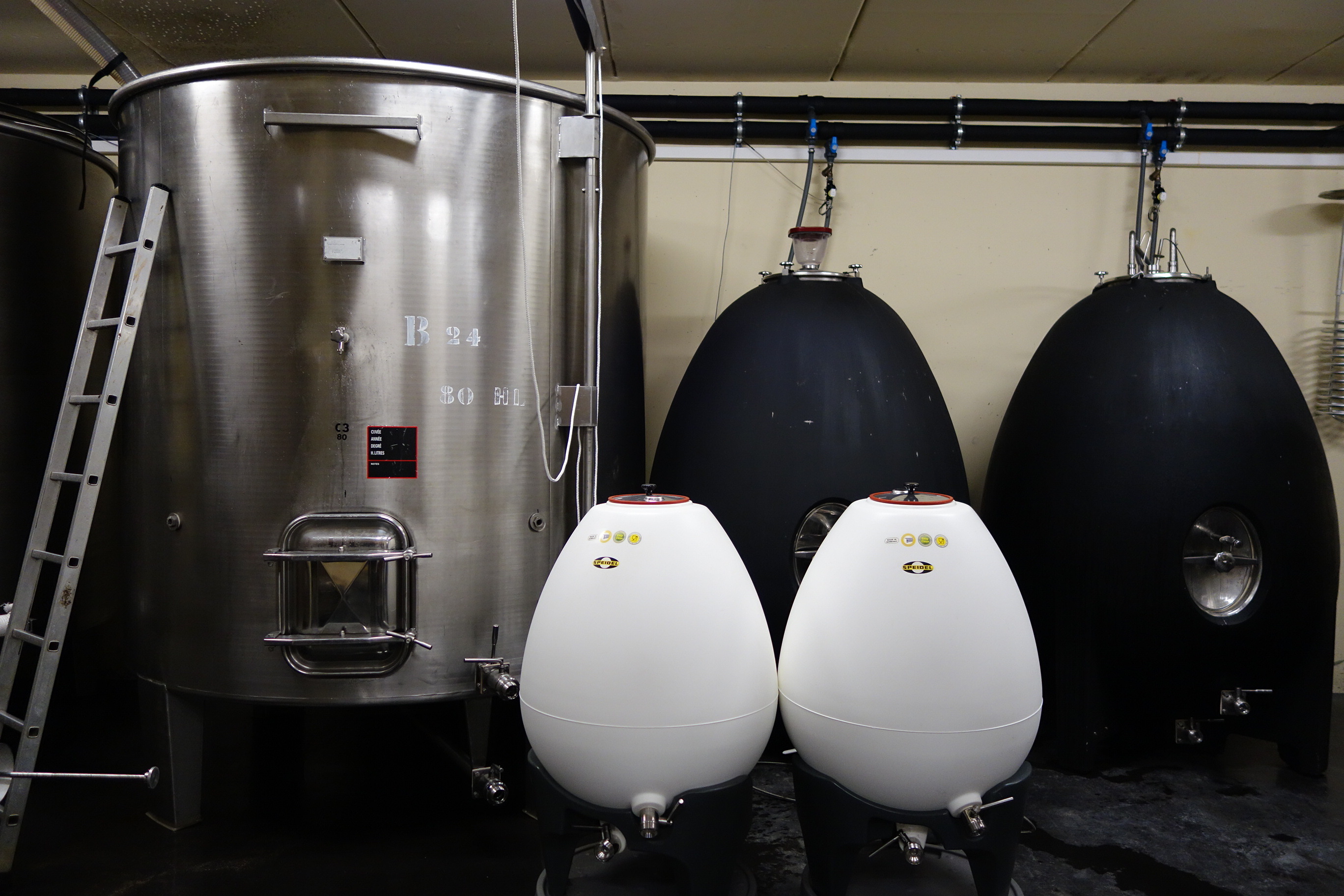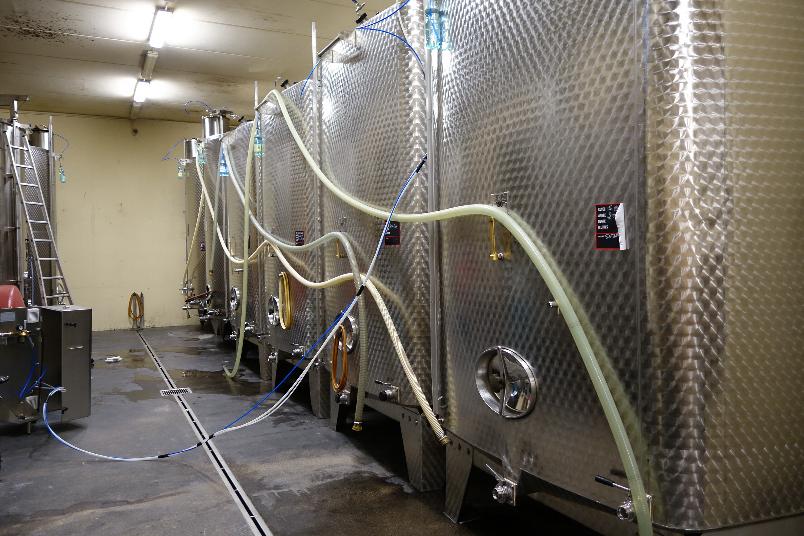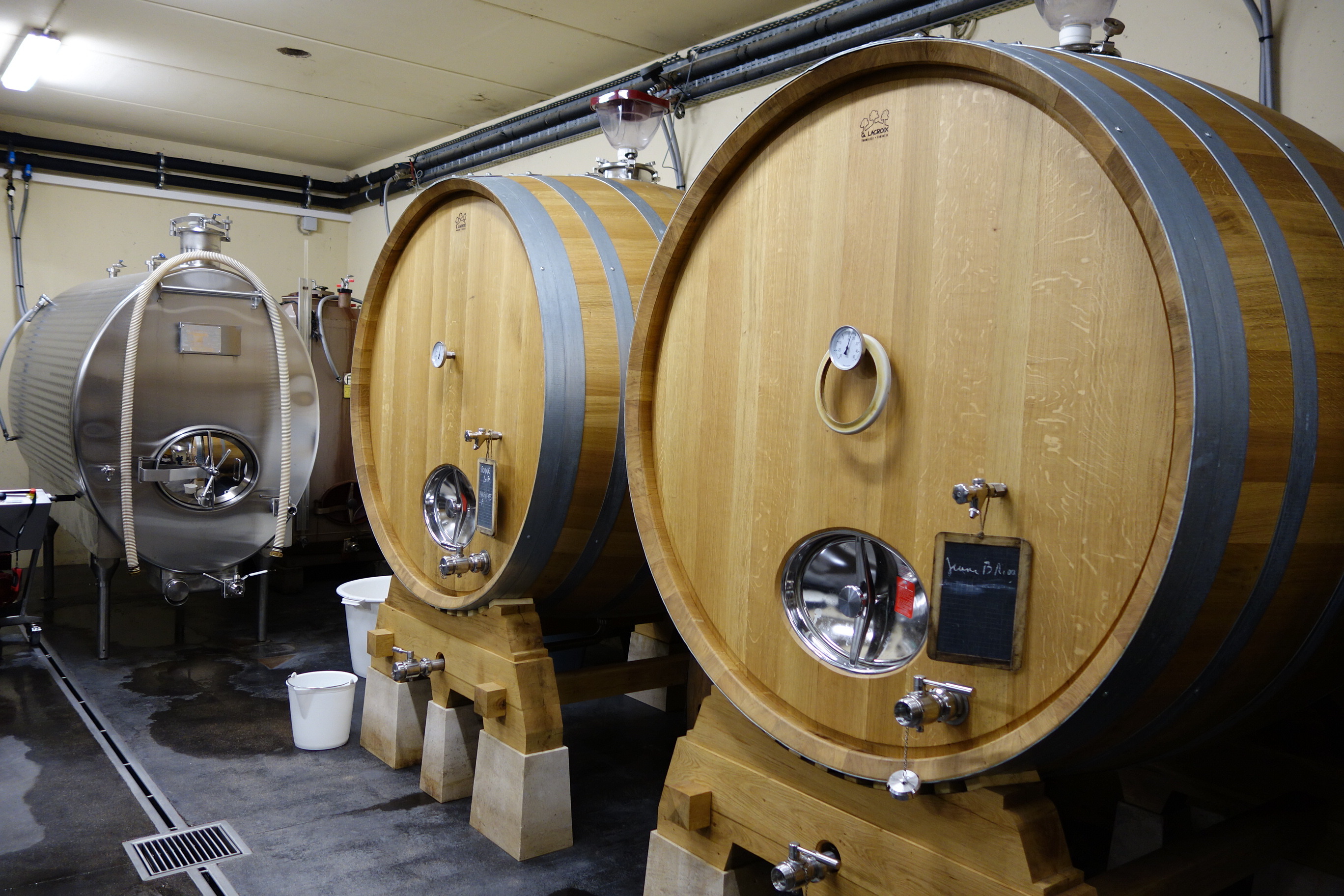 除梗しない。天然酵母のみで発酵。ステンレスタンクを中心とした清潔な醸造。一部「ウフ・ノンブロ」(卵型コンクリート製タンク)を使用