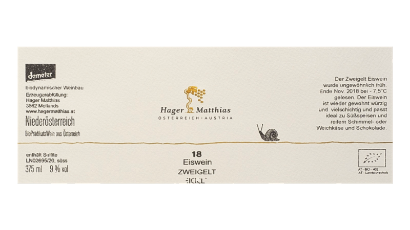 アイスヴァイン ツヴァイゲルトツヴァイゲルト100%のアイスワインです。片麻岩・シスト土壌。樹齢約50年のVV。ステンレスタンクで発酵後、小樽で12ヶ月間熟成。残糖は179.1g/l。