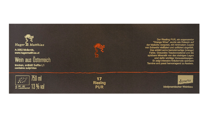 リースリング ピュールリースリング100%。片麻岩土壌。樹齢約50年のVV。50%をステンレスタンクで、50%を小樽で3週間マセラシオンさせた後、小樽で15ヶ月間熟成させたオレンジワインです。ビン詰め時にのみ極少量のSO2を使用。