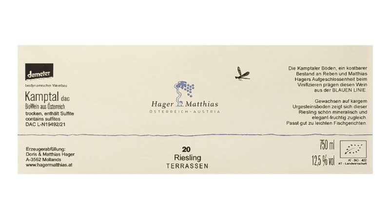 リースリング テラッセンKamptal DAC。リースリング100%。0.7ha。粘土質・片麻岩土壌。樹齢約50年のVV。ステンレスタンクで醸造。「ハギャル・マティアス」のスタンダード・リースリングです。