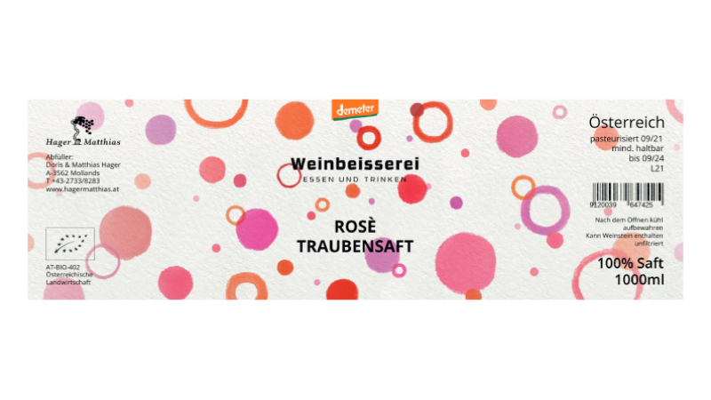 ツヴァイゲルト90%、ブラウブルガー10%のブレンドによる天然ぶどうジュースです。ノンフィルターでビン詰め。添加物は不使用。