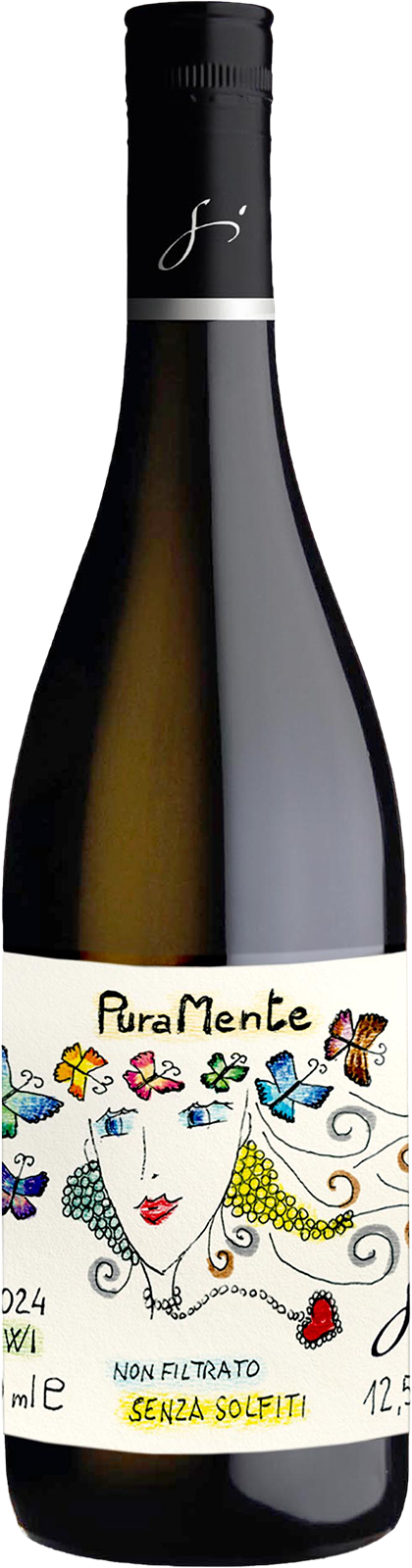 プラメンテIGT Venezia Giulia。ソレリ50%。フルエルタイ(トカイ・フリウラーノとコーカサス原産の野生ぶどうの交配種)50%のブレンド。3ha。沖積土・砂質粘土質・石灰質土壌。樹齢約10年。ステンレスタンクで発酵後、7ヶ月間シュール・リー熟成。SO2は不使用。無清澄、ノンフィルターでビン詰め。作品名の「プラメンテ」は「純粋な」という意味で、ラベルの絵はアントニオの姉アンナ・ブリゾットが描いたものです。年産約1300本のみの限定作品で、バックラベルにボトリングナンバーが記載されています。「ソレリはストラクチャー、深み、フローラルでフルーティーな風味をもたらし、フルエルタイはエレガントさ、明るさ、そしてアロマの高揚感を与えます。これらが組み合わさることでエネルギーと柔らかさの絶妙なバランスが生まれ、表現力豊かでありながら洗練されたワインが生まれます」。